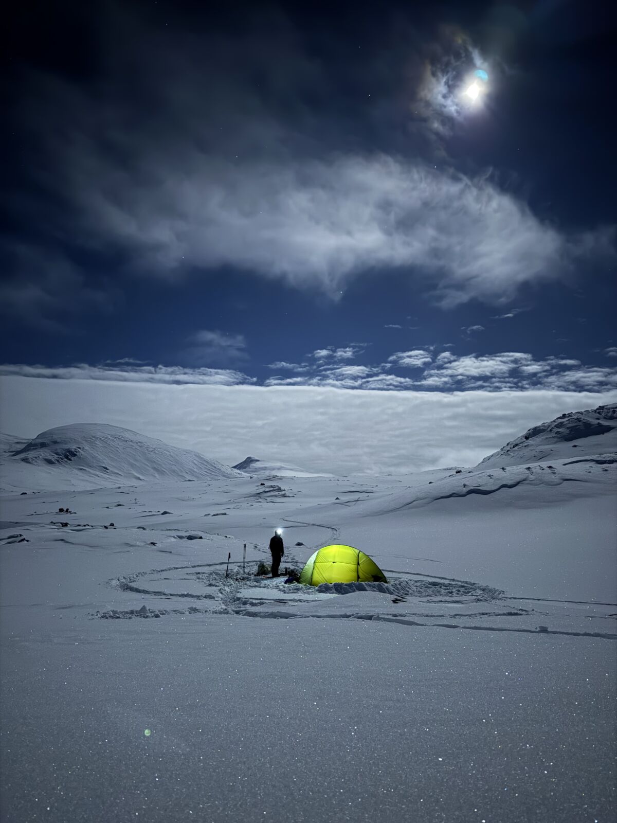 Around the camp, we always trampled a large circle in the snow. When you get up at night to use the bathroom, you can’t just crawl back into your sleeping bag and fall asleep. You have to warm up first – and the circle was perfect for that. After a few laps, your body’s warm enough to sleep again.