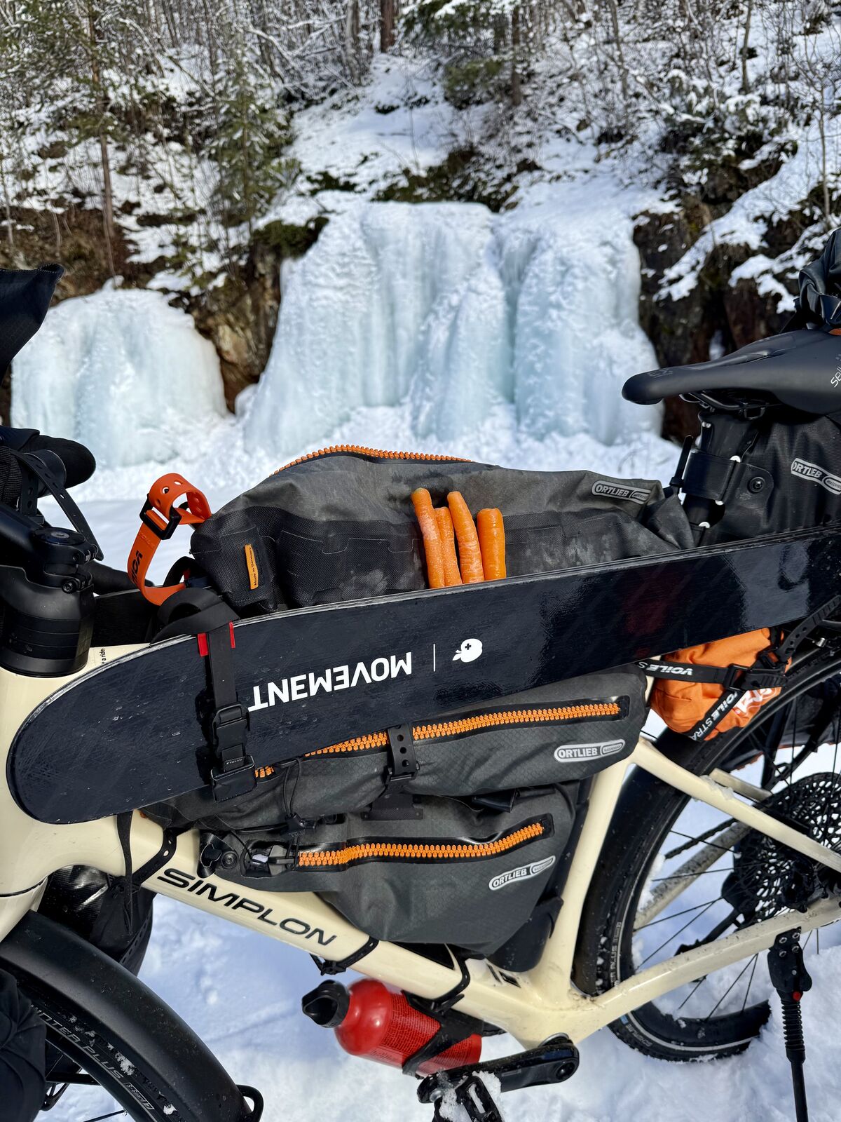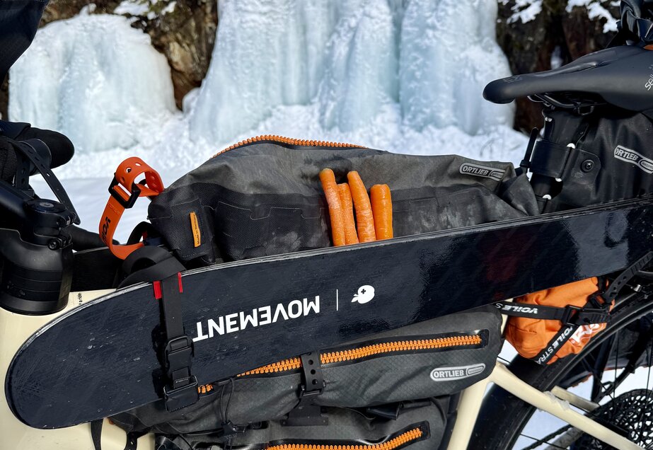 Image The skis were strapped along the top tube. That created a handy space for snacks at the front of the top tube. Fuel bottles for the stove went where the front-wheel dirt lands – those can get dirty anyway. With bikepacking, you pack and repack almost daily, trying different setups and getting better and faster over time. What took 90 minutes at first only took 30 in the end.