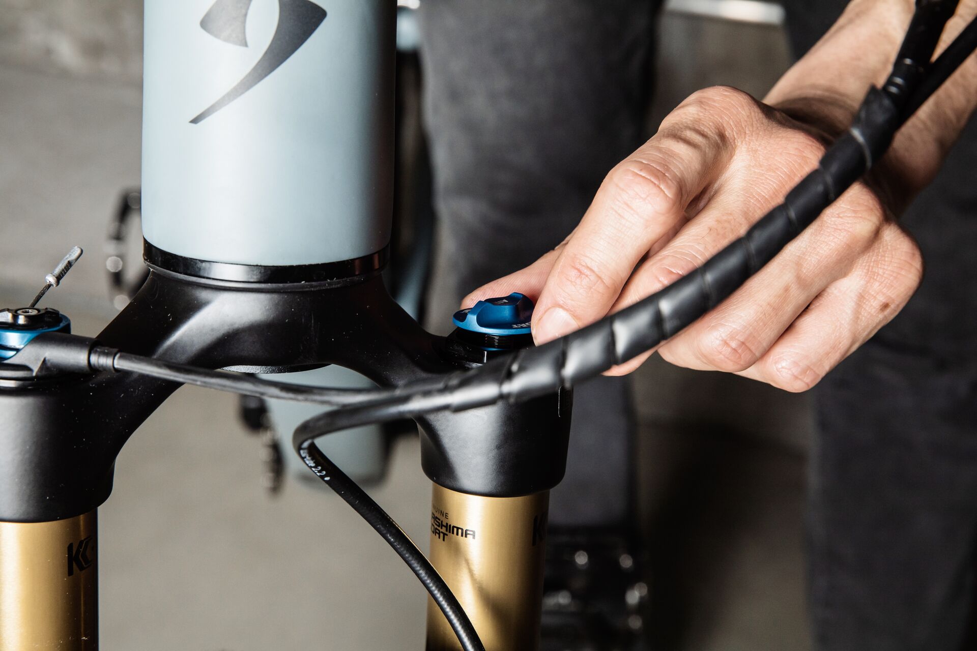 Now you can test your settings. Press the handlebars down with both hands so that the fork compresses. If the front wheel bounces off the ground when you let go, the rebound is set too fast. Set the damping to a higher level until the front wheel no longer goes flying off the ground after you release the handlebars.