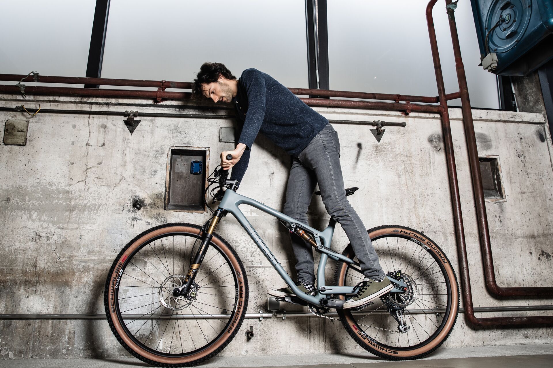 Lean the bike with the handlebars against a neutral surface and assume your standard position on the bike. Hold yourself over the centre of the frame with your arms and legs slightly bent.
